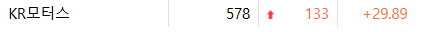 이날 KR모터스는 전 거래일보다 29.89% 상승한 578원에 거래를 마쳤다. 특별한 호재성 공시나 이슈는 없었다.