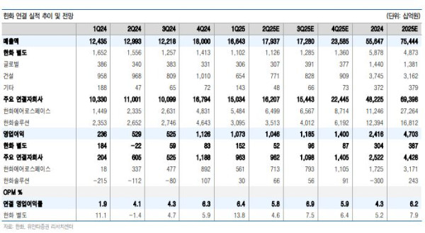 별도 매출액은 1조1000억 원, 영업이익은 522억 원으로 전망했다. 한화모멘텀 분할로 인한 기저효과와 건설부문의 흑자전환으로 이익 턴어라운드를 예상했다.