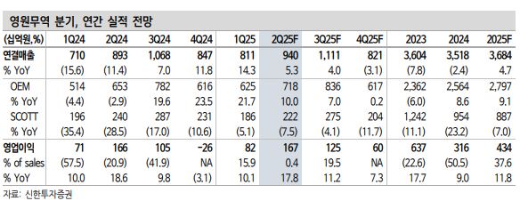 2분기 연결 매출액은 9400억 원, 영업이익은 1671억 원으로 예상했다. 부문별로 OEM 매출이 10% 증가하고 스캇(SCOTT) 매출은 8% 감소했을 것으로 예상해 직전 분기 대비 성장 방향성은 유사했을 것으로 봤다.