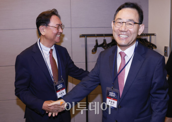 주호영(오른쪽) 국회부의장과 이종재 이투데이그룹 부회장이 23일 서울 중구 대한상공회의소에서 열린 ‘제12회 대한민국 금융대전’에서 인사를 하고 있다. 이투데이가 ‘Re:금융 – 새정부, 새질서, 새기회’를 주제로 마련한 이번 행사는 디지털 전환, ESG 확산, 자산시장의 구조적 변화라는 큰 흐름 속에서 새 정부의 금융정책 방향을 공유하고, 이에 대한 금융회사들의 대응 전략을 다각도로 분석하는 자리다. 조현호 기자 hyunho@