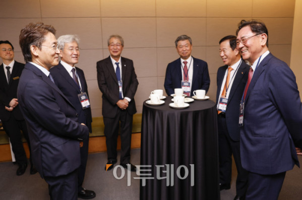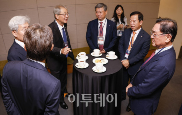 ▲이종재 이투데이그룹 부회장과 고승범 대한민국 금융대전 대회위원장, 권대영 금융위원회 부위원장, 임종룡 우리금융지주 회장 등 참석자들이 23일 서울 중구 대한상공회의소에서 열린 ‘제12회 대한민국 금융대전’에 시작에 앞서 티타임을 갖고 있다. 이투데이가 ‘Re:금융 – 새정부, 새질서, 새기회’를 주제로 마련한 이번 행사는 디지털 전환, ESG 확산, 자산시장의 구조적 변화라는 큰 흐름 속에서 새 정부의 금융정책 방향을 공유하고, 이에 대한 금융회사들의 대응 전략을 다각도로 분석하는 자리다. 조현호 기자 hyunho@
