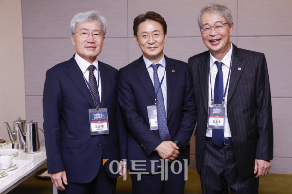 ▲고승범(왼쪽) 대한민국 금융대전 대회위원장과 권대영(가운데) 금융위원회 부위원장, 임종룡 우리금융지주 회장이 23일 서울 중구 대한상공회의소에서 열린 ‘제12회 대한민국 금융대전’에서 기념촬영을 하고 있다. 이투데이가 ‘Re:금융 – 새정부, 새질서, 새기회’를 주제로 마련한 이번 행사는 디지털 전환, ESG 확산, 자산시장의 구조적 변화라는 큰 흐름 속에서 새 정부의 금융정책 방향을 공유하고, 이에 대한 금융회사들의 대응 전략을 다각도로 분석하는 자리다. 조현호 기자 hyunho@