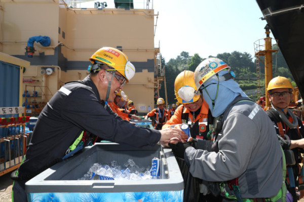 실제로 김 대표는 이날 제조총괄 이길섭 부사장 등 생산·안전 담당 임원들과 함께 1도크 주변 휴게실을 방문해 휴식 공간의 환경을 직접 점검했다. 도보로 걸어다니며 각 시설의 상황을 모두 확인한 김희철 대표는 현장에서 만난 근로자들에게 체온을 낮춰줄 개인용 쿨토시, 쿨마스크도 직접 건넸다.