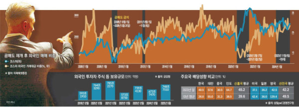 실제 과거 세 차례 공매도 제재 및 재개 후 외국인 거래대금 변동을 보면 첫 공매도 거래 금지 기간에는 코스피 외국인 거래대금 비중이 17%에서 공매도 재개 후 1년간 20%로 증가했다. 2차 금지 기간 전후에는 17%에서 23%, 3차 금지 기간 전후에는 16%에서 22%로 외국인 비중이 는 바 있다.