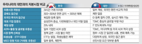 대만은 대체로 우리보다 투자하기 좋은 환경이다. 대만 가권지수(TAIEX)와 장외거래 종목 수는 약 1000개(지난해 말 기준)로 우리나라의 절반이 안 되지만, 시총에서 외국인이 차지하는 비중은 40%로 우리보다 10%포인트 앞선다. 연구·개발(R&D) 세액공제는 반도체 산업에서 25%로 우리나라 15% 이내와 비교해서 높은 편이다. 자사주 소각 제도의 경우도 절차가 간단해 적극적으로 소각이 이뤄진다고 한다.