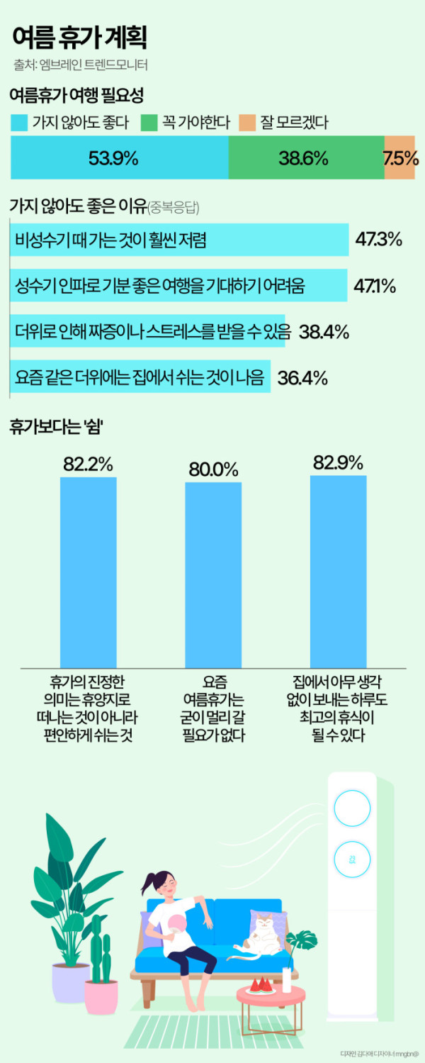 엠브레인 트렌드모니터가 수도권에 거주하는 전국의 만 19~59세 성인 남녀 1000명을 대상(6월 30일~7월 3일)으로 '2025 여름휴가 인식 조사'를 실시한 결과 '여름휴가에 여행을 가지 않아도 좋다(53.9%)'가 '여름휴가에는 꼭 여행을 가야 한다(38.6%)'를 앞섰다.