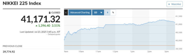 23일 아시아 증시는 일본 증시를 중심으로 상승세를 이어갔다. 미국과 관세 협상을 마무리한 일본 증시는 3%대 상승세를 유지했다. 중국 증시는 보합권에 머물렀다.