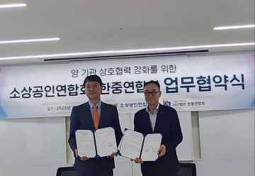 (사)한중연합회(회장 박승찬·왼쪽)와 (사)소상공인연합회(회장 송치영) 양 기관 간 소상공의 발전과 중화권 시장진출을 위한 업무협약식이 지난 18일 소상공인연합회 디지털 교육센터에서 열렸다.