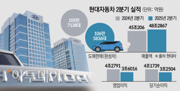 현대차는 연결재무제표 기준 2분기 매출액 48조2867억 원, 영업이익 3조6016억 원, 당기순이익 3조2504억 원을 기록했다고 24일 밝혔다. 매출액은 전년 같은 기간보다 7.3% 증가한 반면, 영업이익은 15.8% 감소했으며 영업이익률은 7.5%를 나타냈다.
