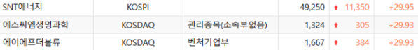 이날 SNT에너지는 전 거래일보다 29.95% 상승한 4만9250원에 거래를 마쳤다. 올해 2분기 호실적을 냈다는 소식의 영향을 받은 것으로 풀이된다.
