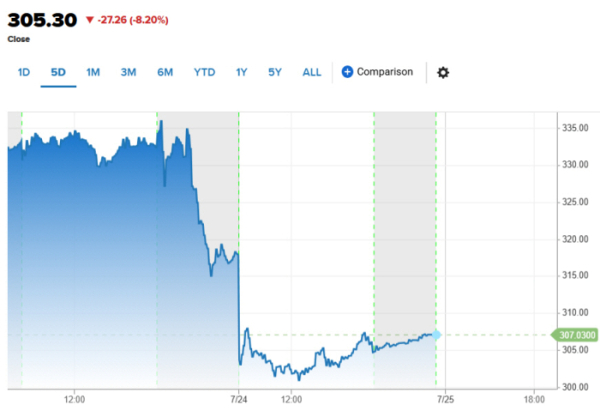IBM은 2분기 호실적을 발표하고도 부진했다. 주가는 7.56% 하락한 260.51달러에 마감했다. 낙폭은 15개월 만에 가장 컸다.