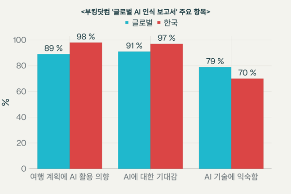 25일 부킹닷컴이 올해 4~5월 세계 33개국 3만7000여 명(한국 여행자 1006명 포함)을 대상으로 실시한 '글로벌 AI 인식 보고서'에 따르면 '향후 여행계획에 AI를 활용하겠다'는 응답은 글로벌 평균 89%를 기록했다. 한국은 98%였다.