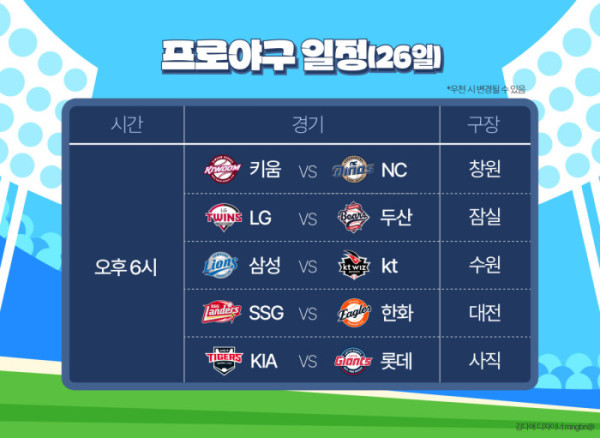 △7월 26일 프로야구 경기 일정- 키움 vs NC (창원·18시)- LG vs 두산 (잠실·18시)- 삼성 vs kt (수원·18시)- SSG vs 한화 (대전·18시)- KIA vs 롯데 (사직·18시)