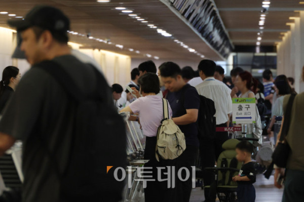 ▲휴가철을 앞두고 25일 서울 강서구 김포공항 국내선이 여행객으로 붐비고 있다. 한국공항공사에 따르면 휴가철 항공기 2만4067편이 뜨고 내리고, 승객 431만명이 공항을 이용할 것으로 예상했다. 일평균으로는 항공기 1416편, 승객 25만3000명으로, 지난해 같은 기간(10365편·23만8729명)보다 소폭 증가했다. 공항별로는 김포공항이 25일, 김해공항이 26일, 제주공항이 내달 4일에 가장 많은 여객이 몰릴 예정이다. 고이란 기자 photoeran@