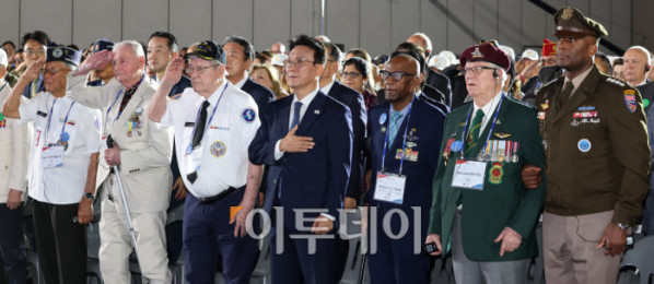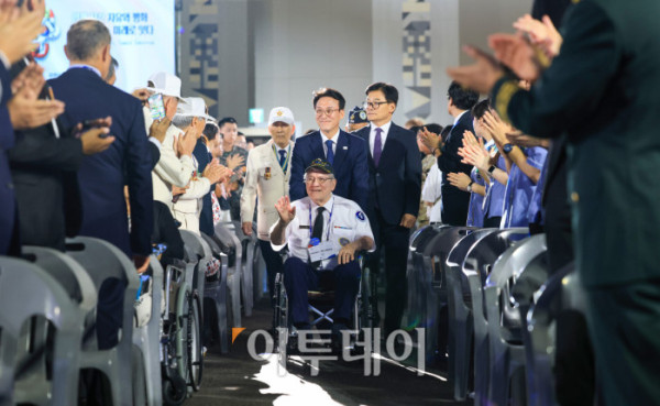 ▲김민석 국무총리가 27일 경기 고양시 일산서구 킨텍스에서 열린 2025년 유엔군 참전의 날 기념식에서 유엔참전용사와 입장하고 있다. 조현호 기자 hyunho@