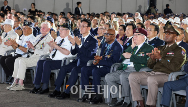 ▲김민석 국무총리와 제이비어 브런슨 유엔군 사령관을 비롯한 참전용사들이 27일 경기 고양시 일산서구 킨텍스에서 열린 2025년 유엔군 참전의 날 기념식에서 박수를 치고 있다. 조현호 기자 hyunho@