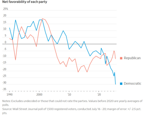 월스트리트저널(WSJ)은 26일(현지시간) 등록 유권자 1500명을 대상으로 16일부터 20일까지 벌인 여론조사(오차범위 ±2.5%) 결과를 공개하고, 미국 유권자의 63%가 민주당에 대해 부정적인 견해를 지닌 것으로 나타났다고 보도했다. 이는 민주당에 대한 긍정적 응답(33%)을 30%포인트(p)나 웃돈 것이자 1990년 이후 가장 높은 수치다.