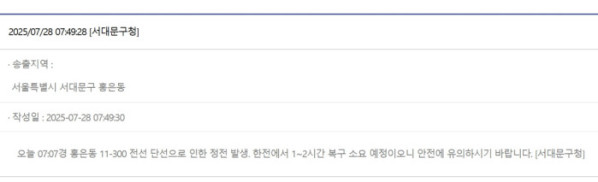 서대문구는 안전재난문자를 통해 "홍은동 11-300 전선 단선으로 인한 정전 발생. 한전에서 1~2시간 복구 소요 예정이오니 안전에 유의 바란다"고 안내했다.