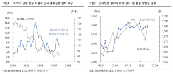 iM증권은 28일 "특히 한국 등 여타 주요국과의 관세 협상도 8월 1일 이전까지 타결되고 중국과도 관세 유예 연장에 합의할 경우 달러화 약세 압력은 추가로 확대될 것"이라며 이같이 밝혔다.