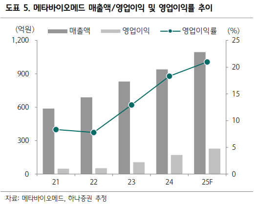 최 연구원은 "메타바이오메드의 2분기 매출액은 전년 대비 9.6% 증가한 278억 원, 영업이익은 56.3% 늘어난 58억 원으로 1분기 호실적에 이어 창립 사상 최대 실적을 경신할 전망"이라며 "영업이익률은 수익성이 높은 봉합 사업부의 매출 확대 및 기타 부문의 손익분기점(BEP) 실적 달성으로 20.9%를 기록할 것으로 추정한다"라고 내다봤다.