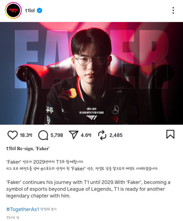 이번 재계약으로 이상혁은 2029년까지 T1 유니폼을 입고 뛰게 된다. 2013년 T1의 전신 ‘SK텔레콤 T1’에 입단한 이래 단 한 번도 이적 없이 한 팀에서만 12시즌을 소화했다. T1은 공식 사회관계망서비스(SNS) 인스타그램을 통해 “리그 오브 레전드를 넘어 e스포츠의 상징이 된 페이커, 전설로 남을 앞으로의 여정도 기대한다”고 전했다.