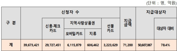 행정안전부는 소비쿠폰 신청·접수를 시작한 지 일주일 만에 지급 대상자의 78.4%인 3967만 명이 신청하고, 7조1200억 원을 지급했다고 28일 밝혔다. 첫 일주일간 지급률은 2020년 긴급재난지원금, 2021년 국민지원금과 비교했을 때 각각 24.0%포인트(p), 10.2%p 높은 수준이다. 26일 온라인 신청 요일제 해제에 이어 이날부터 오프라인 신청도 요일제가 해제돼 집행률은 이주 80%를 넘어설 전망이다. 이미 인천(83.7%), 대전(80.9%), 세종(83.4%), 경기(80.0%) 등 4개 시·도는 집행률이 80%를 넘었다. 가장 낮은 전남(70.4%)도 70%대 집행률을 보인다.