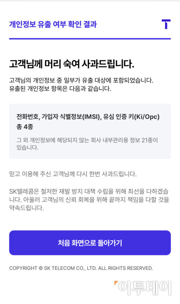 SKT는 휴대전화번호, 가입자 식별번호(IMSI), 유심 인증 키 2종(Ki/OPc) 등 4종의 개인정보와 기타 내부 관리용 정보 21종 등이 유출됐다고 안내했다.