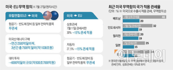 미국과 유럽연합(EU)이 다음 달 발효 예정이던 30%의 고율 관세를 15%로 낮추는 데 합의하면서 대서양 무역전쟁이 일단 봉합됐다. 다만 6000억 달러(약 827조7000억 원) 대미 투자가 조건에 포함됐다.