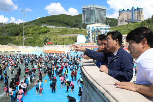 ▲최철규 강원랜드 대표이사 직무대행이 28일 워터월드를 방문해 현장점검을 진행하고 있다. (사진제공=강원랜드)