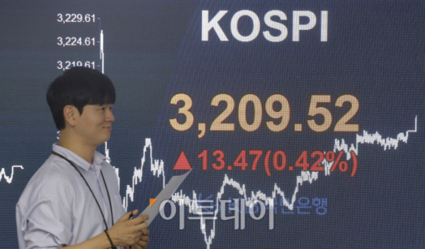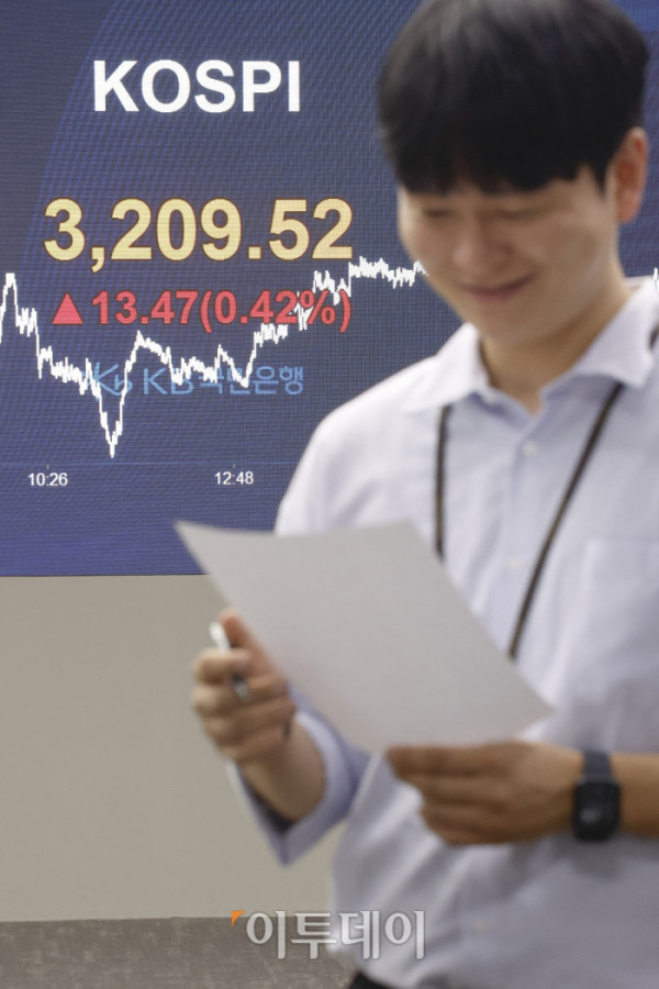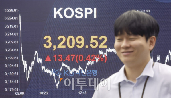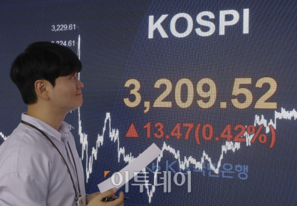 ▲코스피가 외국인과 기관 매수세에 상승하며 3200선을 회복한 28일 서울 영등포구 KB국민은행 딜링룸 전광판에 코스피가 표시돼 있다. 이날 코스피 지수는 전 거래일보다 13.47(0.42%)포인트 상승한 3209.52를 나타냈다. 조현호 기자 hyunho@