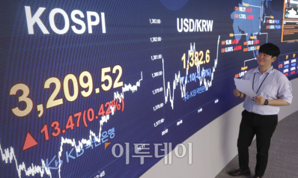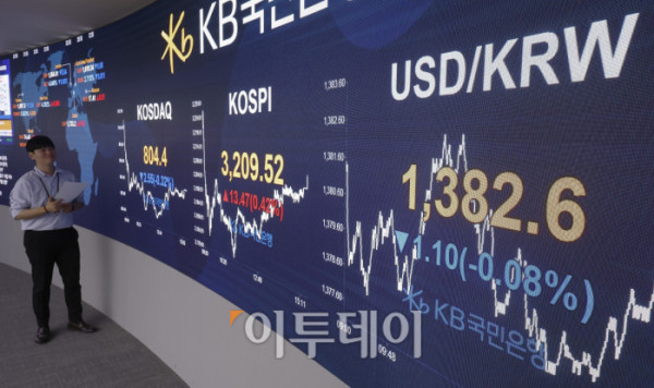 ▲코스피가 외국인과 기관 매수세에 상승하며 3200선을 회복한 28일 서울 영등포구 KB국민은행 딜링룸 전광판에 코스피, 원·달러 환율이 표시돼 있다. 이날 코스피 지수는 전 거래일보다 13.47(0.42%)포인트 상승한 3209.52를 나타냈다. 원·달러 환율은 종가 기준 1382.3원을 나타냈다. 조현호 기자 hyunho@