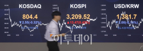 ▲코스피가 외국인과 기관 매수세에 상승하며 3200선을 회복한 28일 서울 영등포구 KB국민은행 딜링룸 전광판에 코스피, 코스닥, 원·달러 환율이 표시돼 있다. 이날 코스피 지수는 전 거래일보다 13.47(0.42%)포인트 상승한 3209.52를 코스닥 지수는 2.55(0.32%)포인트 하락한 804.4를 나타냈다. 원·달러 환율은 종가 기준 1381.7원을 나타냈다. 조현호 기자 hyunho@