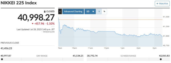 닛케이225지수(닛케이)는 전 거래일 대비 457.96포인트(1.10%) 하락한 4만998.27엔에, 기술주 중심의 토픽스도 전일 대비 21.13포인트(0.72%) 떨어진 2930.73으로 마감했다.