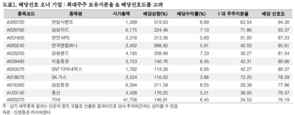 신영증권에 따르면 최대주주 지분율이 높은 기업 중에서 배당선호도가 높은 기업은 한일시멘트, 삼성카드, 한전KPS, 한국앤컴퍼니, 강원랜드, 키움증권, SNT다이내믹스, SK가스, 삼성증권, 풍산, 기아 등이 있다.