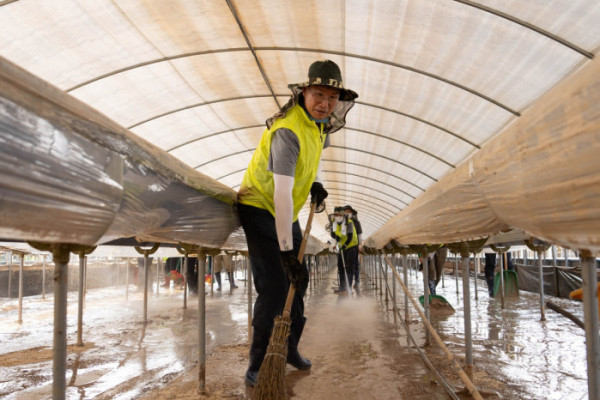 이날 폭염에도 강태영 은행장을 비롯한 임직원들은 당진시 관내 농·축협 임직원들과 함께 피해복구에 총력을 다했다. 피해농가 비닐하우스의 토사를 제거하고 피해 작물 및 폐기물 정리에 구슬땀을 흘렸다.