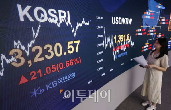 ▲코스피가 5거래일 연속 상승하며 4년만에 최고치를 경신한 29일 서울 영등포구 KB국민은행 딜링룸 전광판에 코스피, 원·달러 환율이 표시돼 있다. 이날 코스피 지수는 전 거래일보다 21.05(0.66%)포인트 상승한 3230.57을 나타냈다. 코스피가 3230선에 도달한 것은 2021년 8월 3일(3237.14) 이후 4년여만이다. 원·달러 환율은 종가 기준 1392.2원을 나타냈다. 조현호 기자 hyunho@