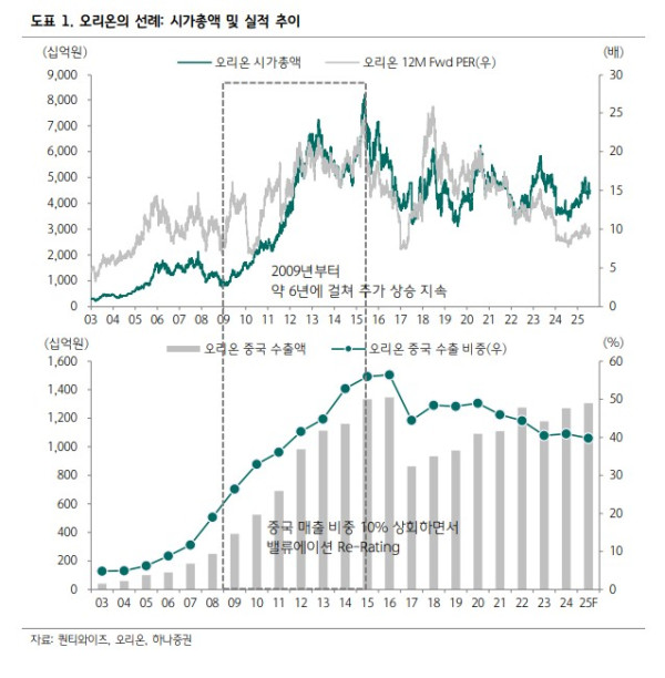 심 연구원은 오리온 사례와 비교했다. 그는 "과거 오리온은 중국 수출이 유의미하게 상승함에 따라 시가총액이 1조 원에서 8조 원까지 증가했다"며 "동기간 밸류에이션은 약 5배에서 25배로 리레이팅됐다"고 말했다. 이어 "주가 리레이팅은 2009년~2013년 초까지 약 4년에 걸쳐 빠르게 전개된 이후 약 2년의 정체기를 갖다가 6년이 지난 시점인 2015년에 정점을 기록했다"며 "삼양식품의 주가 리레이팅이 시작된 시점은 2023년이다. 아직 2년 차에 불과하다"고 짚었다.