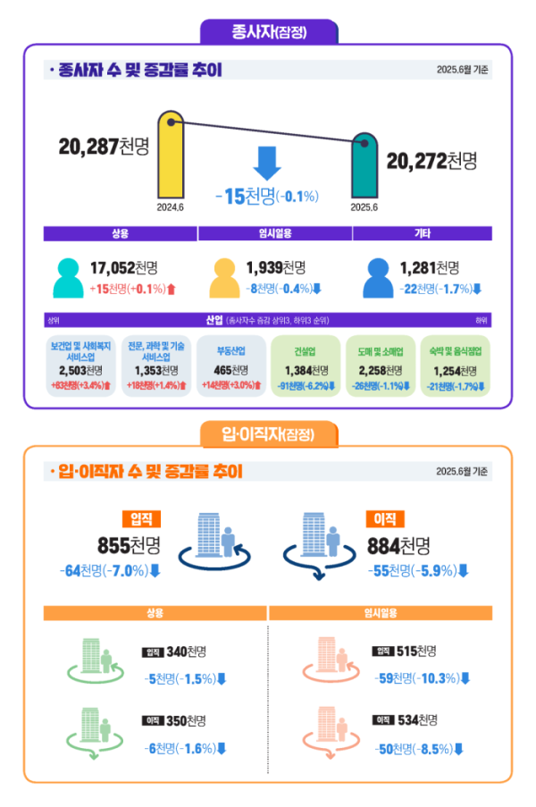 다만, 종사자 감소세가 장기간 이어지진 않을 것이라는 게 고용부의 판단이다. 김재훈 노동시장조사과장은 브리핑에서 “숙박·음식점업이나 도·소매업은 정부에서 소비쿠폰도 발행하고 했기 때문에 조금 좋아질 여지는 보인다”고 말했다.