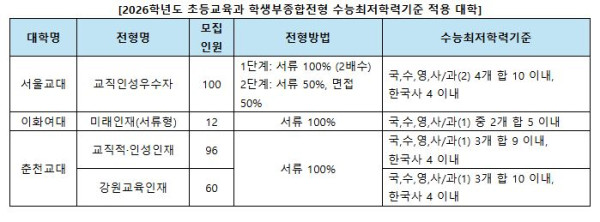 학생부종합전형은 일반적으로 수능최저학력기준을 적용하지 않지만, 일부 전형에서는 기준이 설정돼 있다. △서울교대 △이화여대 △춘천교대 △강원대 등의 전형이 대표적이며 이 중 일부는 2026학년도 기준을 완화했다. 반면, 전년도까지 수능최저를 적용하던 △전주교대 △진주교대는 이를 폐지해 합격선 상승 가능성이 제기된다.