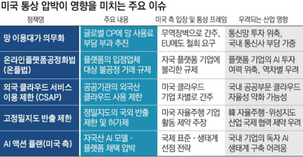 업계 관계자는 “망 사용료나 온플법, 지도 반출은 시작에 불과할 것”이라며 “최근에는 미국의 AI 모델을 쓰도록 압박하는 AI액션 플랜까지 내세우며 AI 정책과 산업 생태계 전반에 대한 간접적인 압박 수위를 높이고 있다”고 말했다.