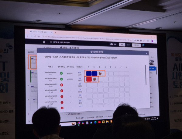 김재현 신목중 교사는 AIDT를 활용한 수학 수업 시연을 진행했다. 김 교사는 “AIDT로 수업을 하면 학생들의 성취도, 참여율, 감정 등 다양한 학습 데이터가 기록된다”며 “교사가 실시간으로 어떤 빠른 학습자와 느린 학습자를 파악할 수 있어 적절한 피드백이 가능하다”고 강조했다.