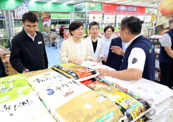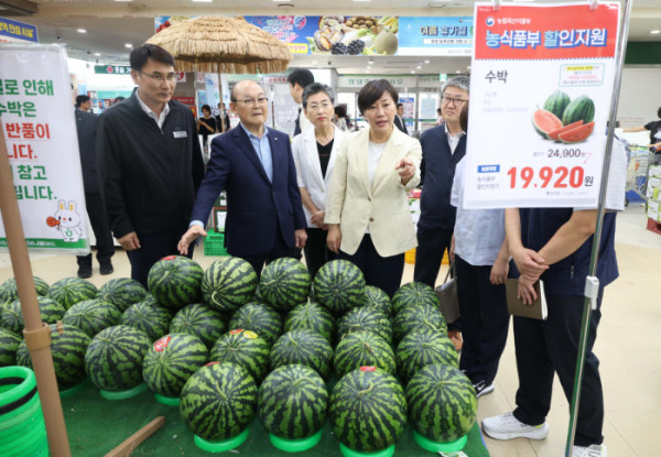 ▲송미령 농림축산식품부 장관이 30일 서울 관악구 서울서남부농협 하나로마트를 찾아 여름철 농축산물 할인지원 현장 점검을 하고 있다. 신태현 기자 holjjak@