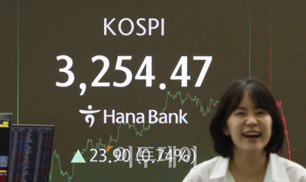 30일 한국거래소에 따르면 코스피지수는 전 거래일보다 23.90p(0.74%) 오른 3254.47으로 거래를 마쳤다. 코스피는 3233.31로 시작해 장중 3269.40을 기록하며 연고점을 경신한 뒤 일부 조정을 받았다.