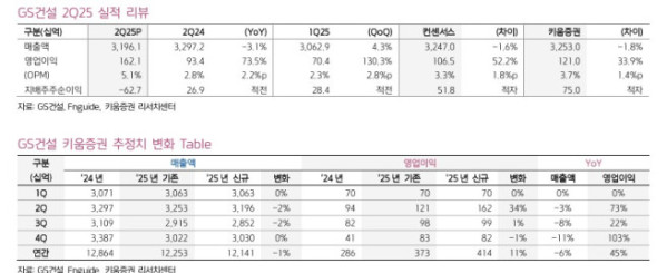 신 연구원은 "GS건설의 2분기 실적은 여러 이슈가 많았지만, 3분기부터는 큰 변화는 없을 것"이라고 짚었다. 그는 "주택건축 부문에서는 1~2분기와 같은 대규모 현장에 대한 도급 증액 예정이 없고, 플랜트 부문의 주요 프로젝트들의 실행 예산이 나왔기 때문에 경상적인 수준의 마진이 나올 것"이라며 "신사업에서도 엘리먼츠 유럽 청산으로 추가 비용은 발생하지 않을 것"이라고 말했다.