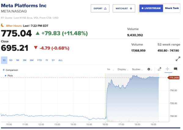 페이스북 모회사 메타의 주가는 시간 외 거래에서 11% 넘게 급등하며 주당 770달러를 돌파했다. 올 2분기 매출과 주당순이익(EPS)이 시장 전망치를 상회한 영향이다.