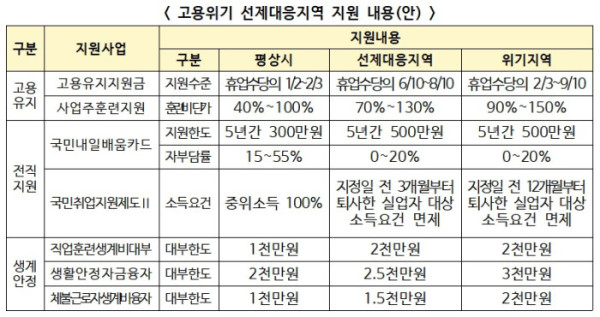 고용위기 선제대응지역 제도는 지역 사업장의 10% 이상에서 예측하지 못한 휴업 등이 발생(우려)했거나, 지역 내 주된 산업에서 피보험자가 3개월 연속 감소했거나, 지역 내 300인 이상 기업에서 상시근로자 10% 이상 구조조정 계획이 있을 때 고용정책심의위원회 심의를 거쳐 지정 가능하다. 선제대응지역으로 지정되면 고용유지지원금, 국민내일배움카드, 국민취업지원제도, 생활안정자금융자 등 지원요건과 지원수준이 우대된다. 단, 고용위기지역보다 지정요건이 간소한 만큼, 지원수준은 일반 지역보단 높되 고용위기지역보다는 낮다.