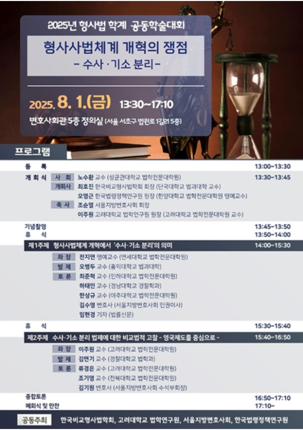 이번 행사는 서울변호사회를 비롯해 한국비교형사법학회, 고려대학교 법학연구원, 한국법령정책연구원이 공동으로 개최한다.