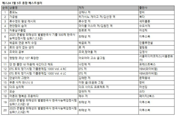 ▲7월 5주 종합 베스트셀러 목록 (예스24)