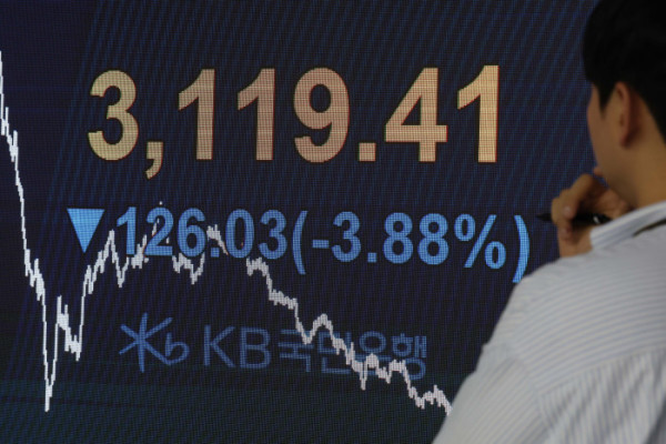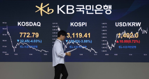 코스피와 코스닥이 세제개편안에 대한 기대감 후퇴로 4% 안팎의 큰 낙폭을 기록한 가운데 1일 서울 여의도 KB국민은행 스마트딜링룸 모니터에 코스피 종가가 표시되고 있다. 이날 코스피는 전일 대비 126.03p(3.88%) 하락한 3119.41에 마감했다. 코스닥은 전일 대비 32.45p(4.03%) 내린 772.79를 기록했다. 원·달러 환율은 달러 강세와 외국인 주식 매도에 두달 여 만에 1400원대로 급등, 서울 외환시장에서 미국 달러화 대비 원화 환율의 주간거래 종가는 전날보다 14.4원 오른 1401.4원으로 집계됐다.