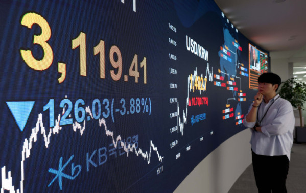 ▲코스피와 코스닥이 세제개편안에 대한 기대감 후퇴로 4% 안팎의 큰 낙폭을 기록한 가운데 1일 서울 여의도 KB국민은행 스마트딜링룸 모니터에 코스피 종가가 표시되고 있다. 이날 코스피는 전일 대비 126.03p(3.88%) 하락한 3119.41에 마감했다. 코스닥은 전일 대비 32.45p(4.03%) 내린 772.79를 기록했다. 원·달러 환율은 달러 강세와 외국인 주식 매도에 두달 여 만에 1400원대로 급등, 서울 외환시장에서 미국 달러화 대비 원화 환율의 주간거래 종가는 전날보다 14.4원 오른 1401.4원으로 집계됐다. 신태현 기자 holjjak@